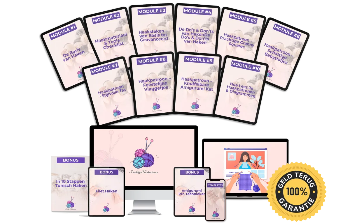 Hoe? Je krijgt volledig uitgewerkte, 100% stap-voor-stap haakpatronen en technieken voor IEDERE STAP van jouw haakavontuur.